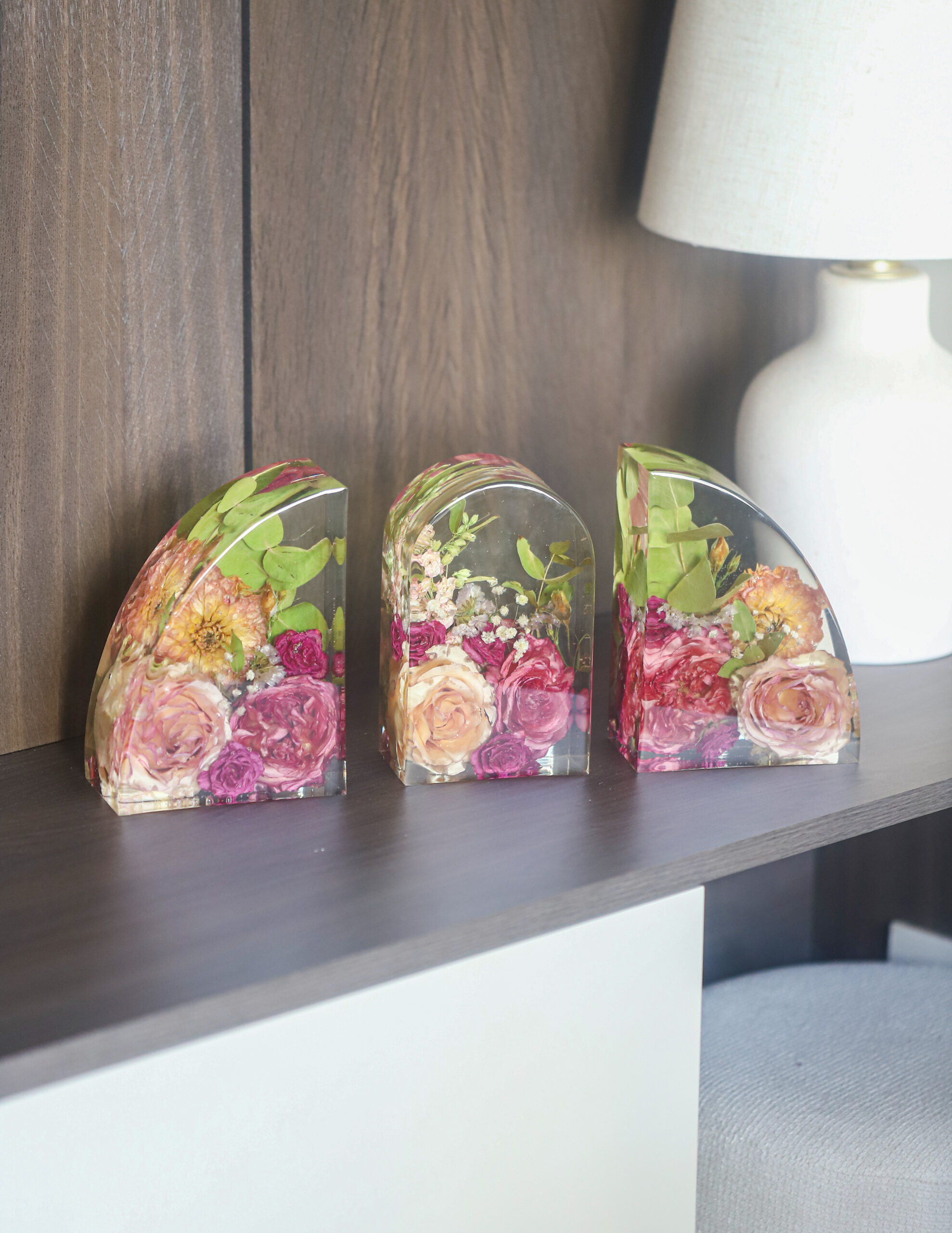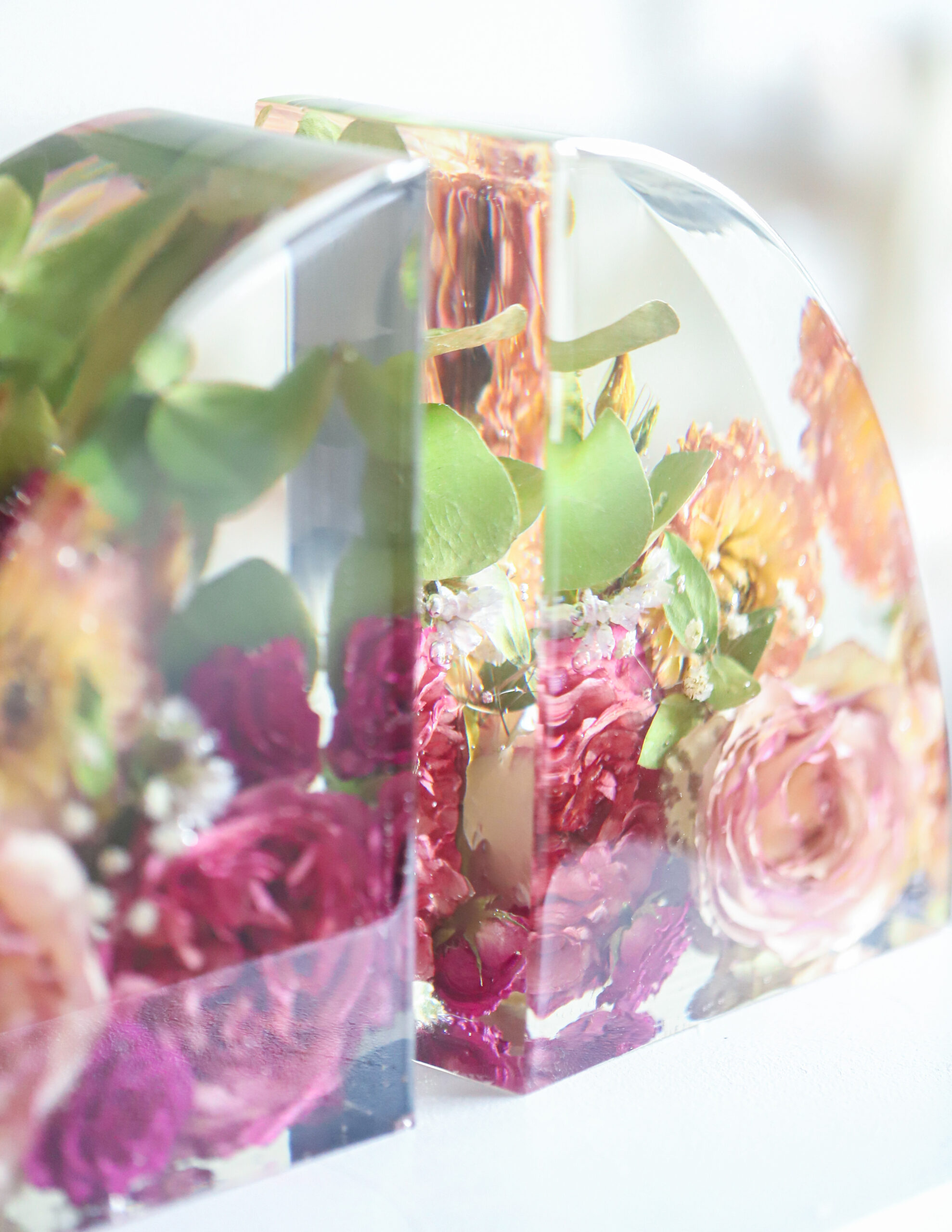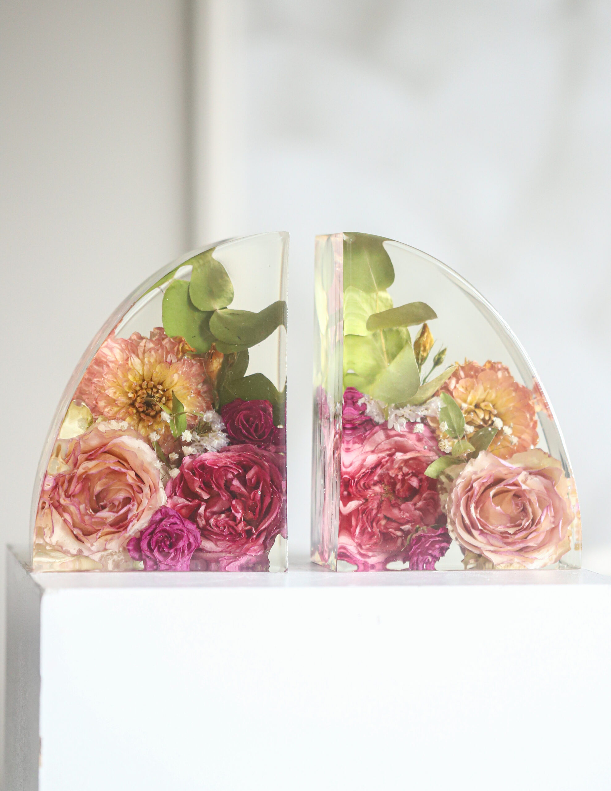De Bookends zijn niet alleen een prachtige eyecatcher in je interieur, maar ook een functioneel item om jouw boeken op hun plek te houden. Elke bookend wordt met de hand gegoten en gevuld met jouw waardevolle bloemen, zodat je elke dag herinnerd wordt aan een bijzonder moment of persoon.