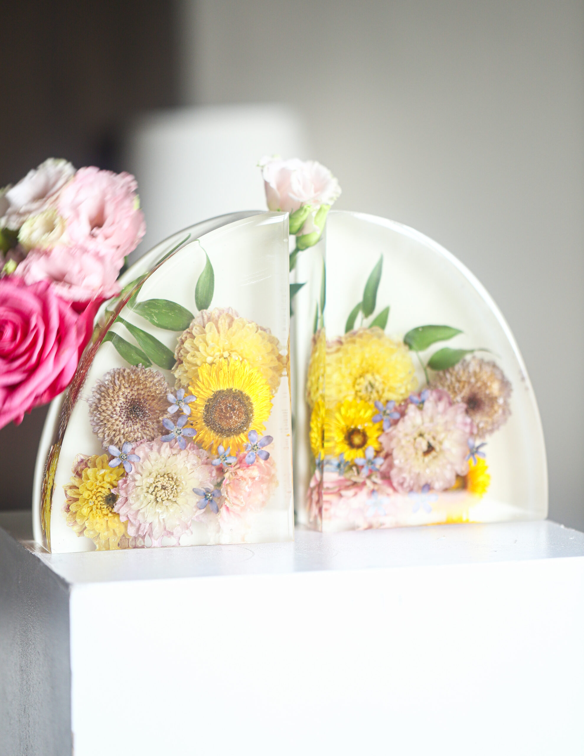 Het blok wordt volledig helder gepolijst, waardoor de bloemen van alle kanten goed zichtbaar zijn en het epoxy een glanzende, transparante uitstraling heeft.Frosted edging