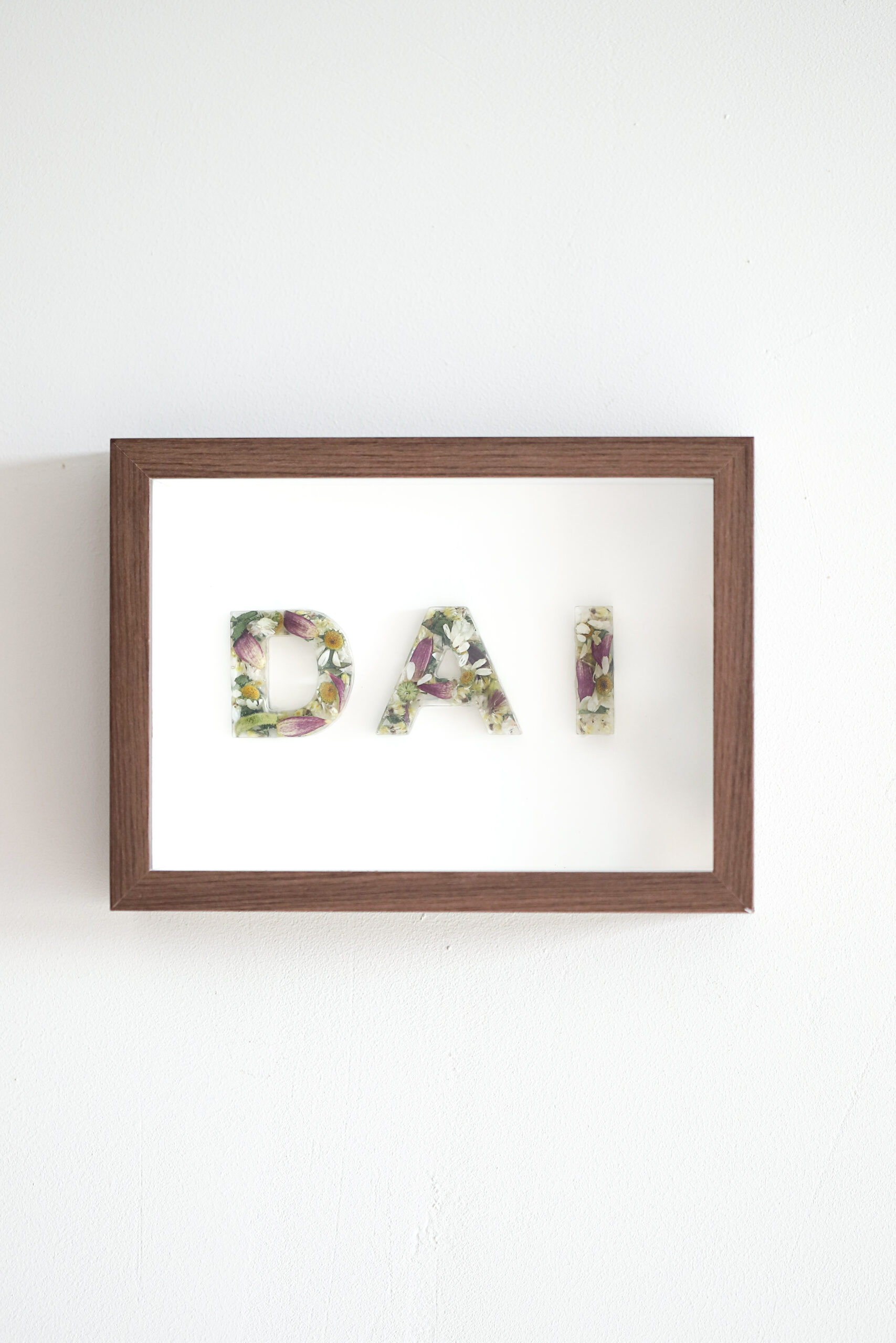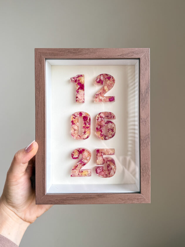 De Date Frame is een unieke manier om een speciale datum, naam of woord te vereeuwigen. In plaats van een traditionele inlijsting of een groter epoxy stuk, vormen we met stukjes uit jouw eigen bruids- of rouwboeket een betekenisvol woord of datum, verwerkt in een stijlvolle, diepe lijst.