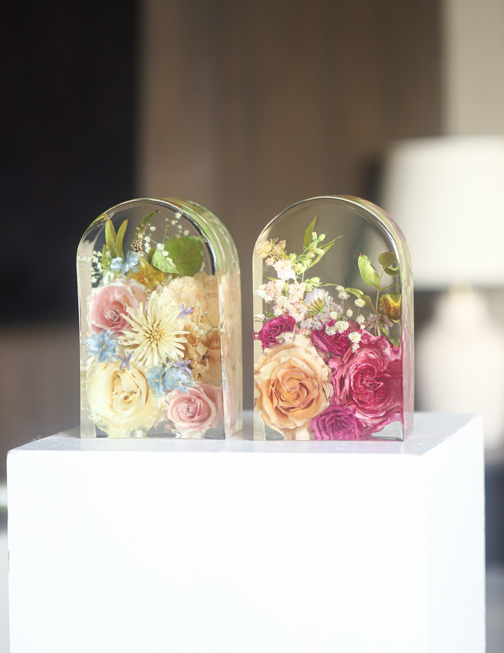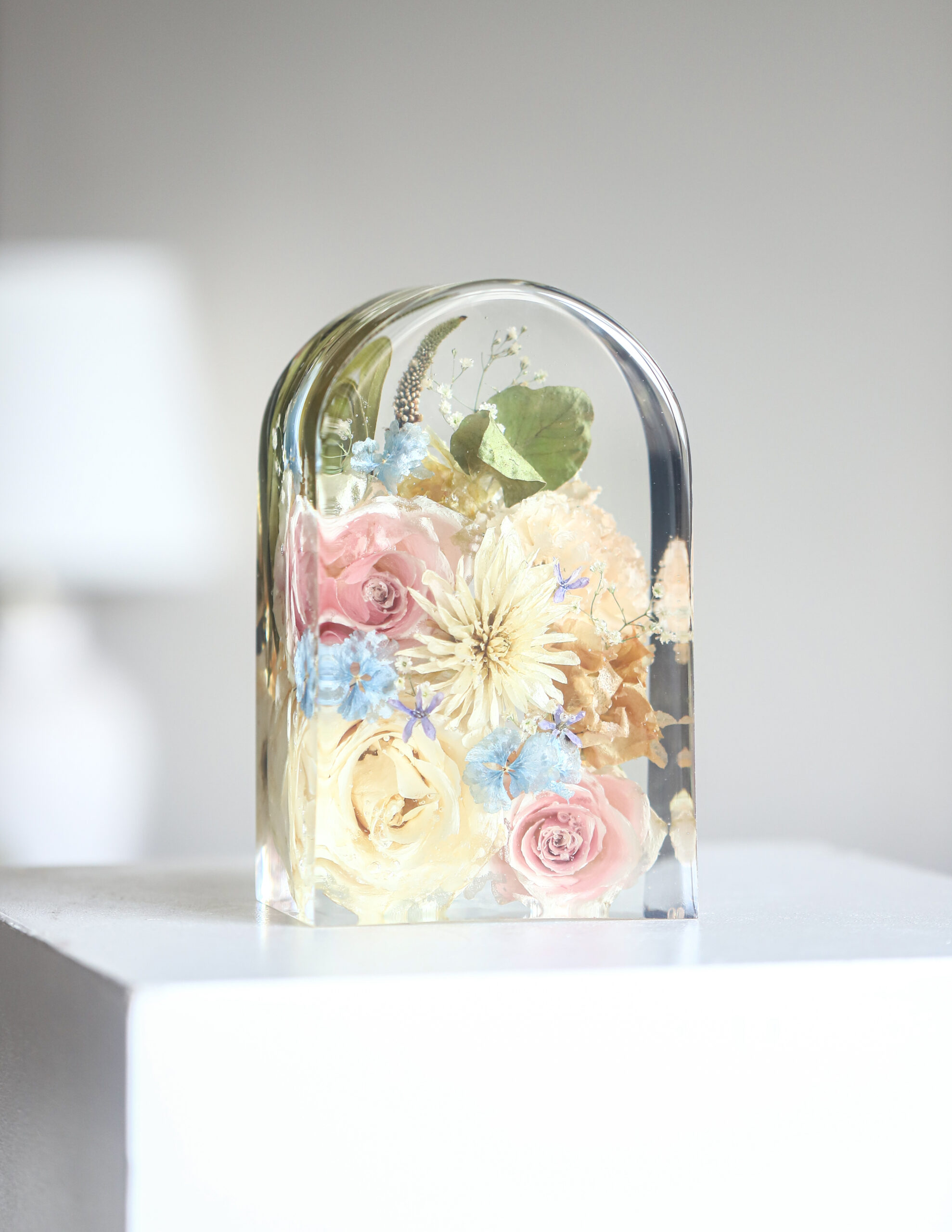 Het blok wordt volledig helder gepolijst, waardoor de bloemen van alle kanten goed zichtbaar zijn en het epoxy een glanzende, transparante uitstraling heeft.Frosted edging
